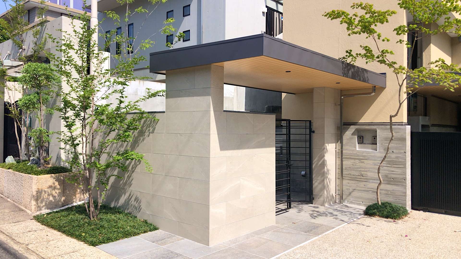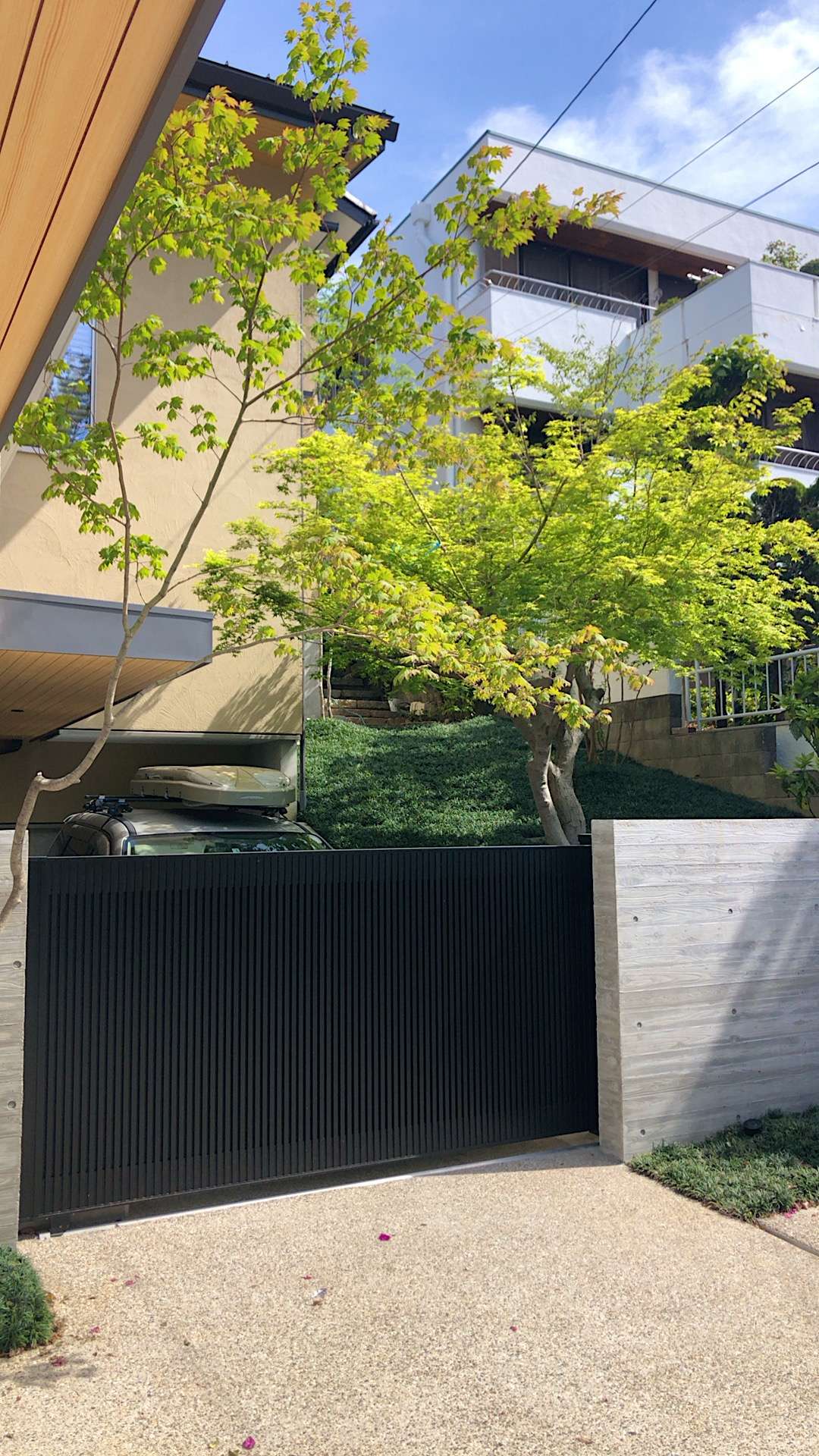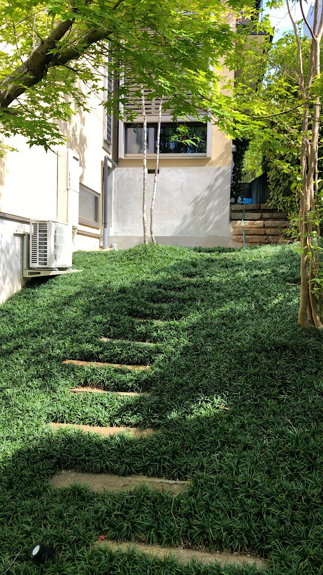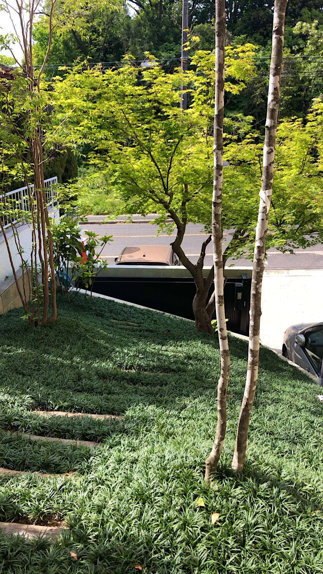 玄関前の植栽計画と駐車場奥の法面の植栽計画をしました。玄関脇にはモミジを配置し、緑の傘がエントランスにかかるように。駐車場奥の法面は、法面保護と管理のことを考えて玉竜マット敷にしています。階段状に踏み石を配置してアオダモや既存のモミジを回り込むように歩けるようにしました。
