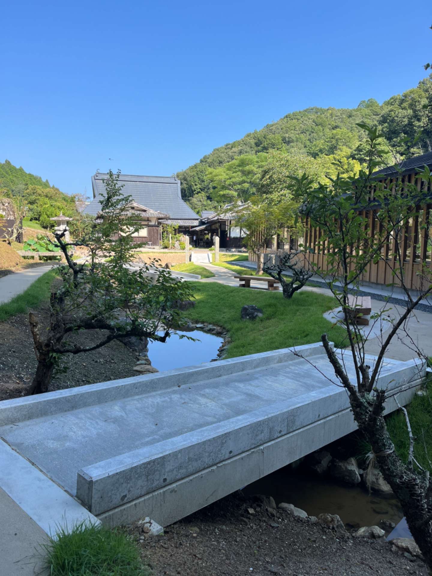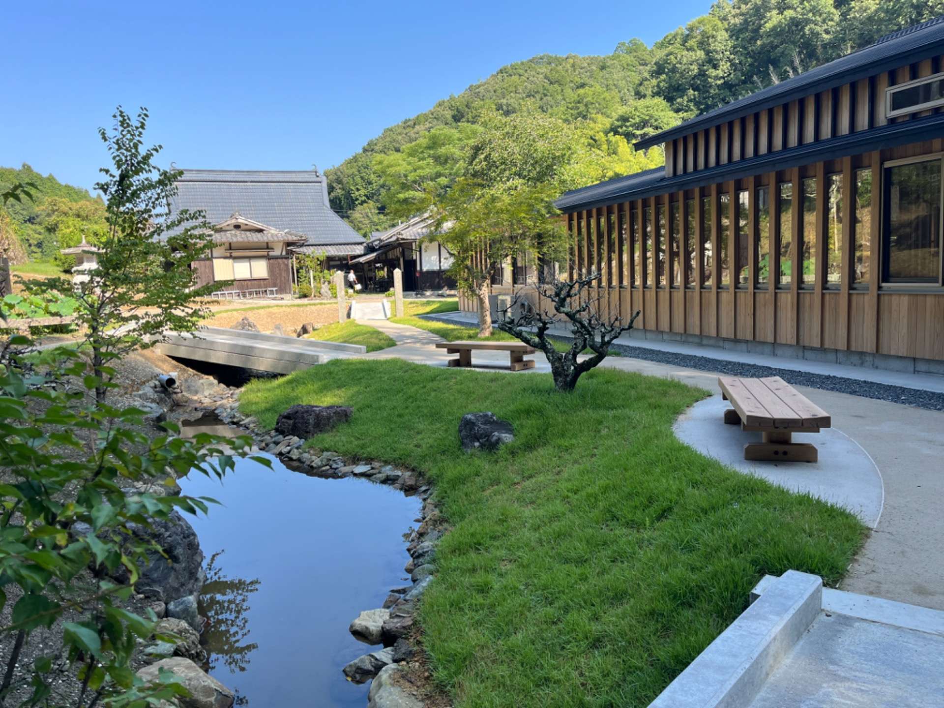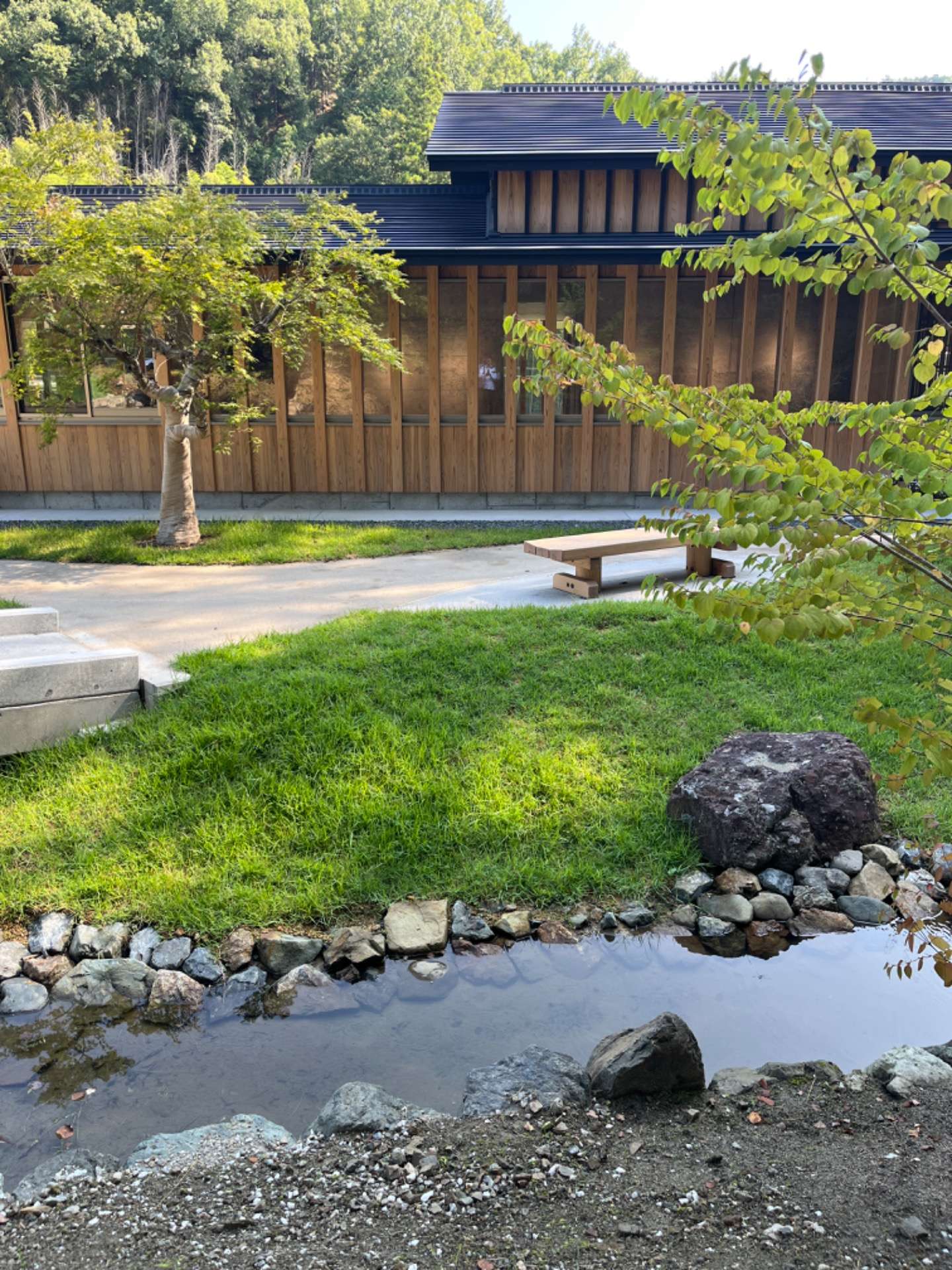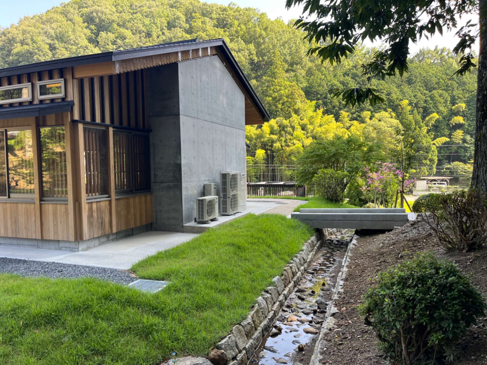 山からの湧水を敷地内に引き込み、池と小さな流れを計画しています。2025年9月、ついにオープンいたしました!式典にも参加させていただきました。