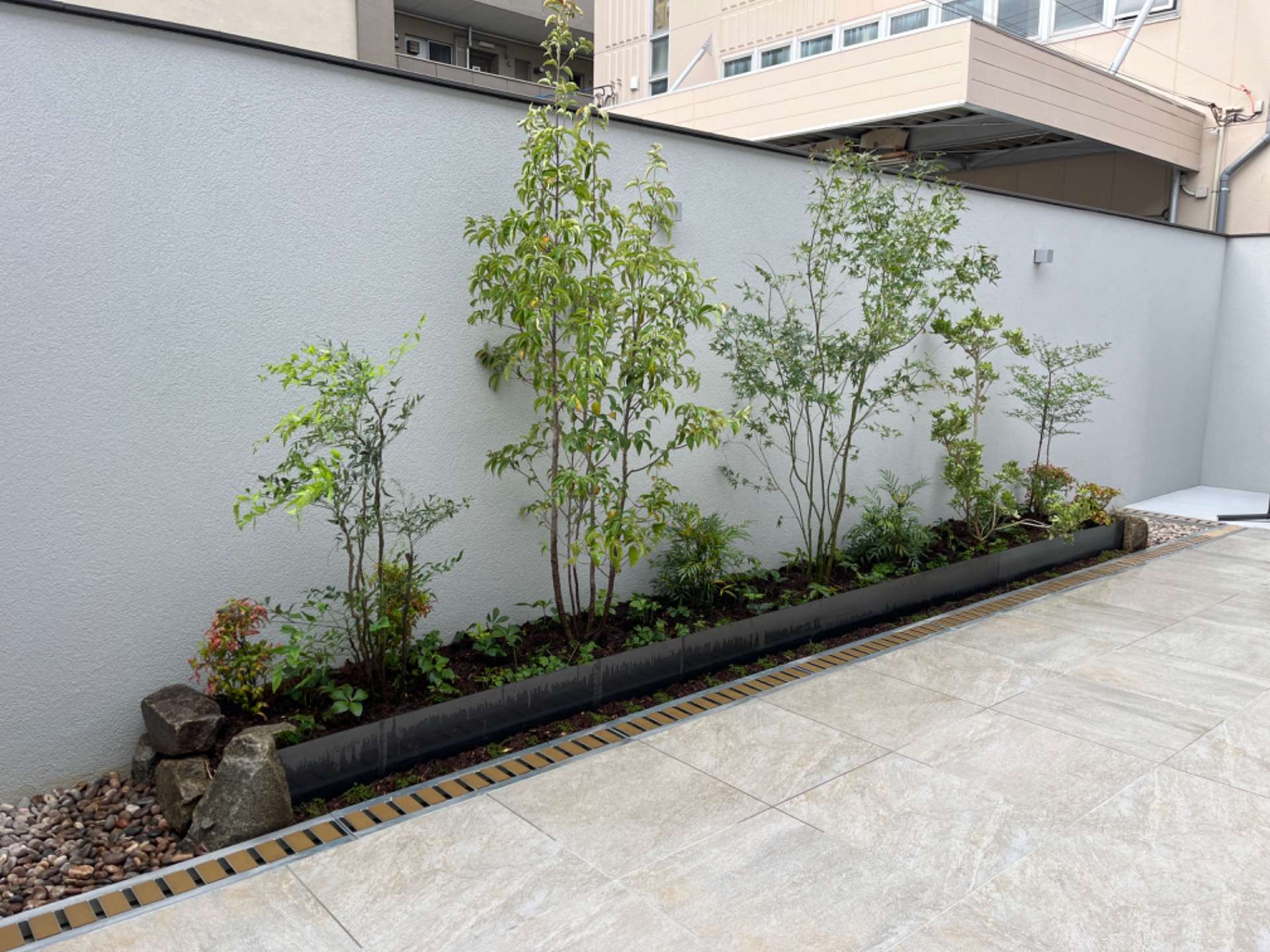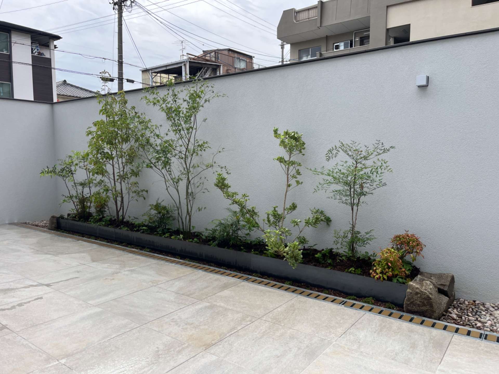 モダンな庭の花壇のデザインをしました。壁に囲まれて大部分がタイル張りのすっきりとした庭の中にどのように自然を入れるのか。奥行き感を出すために花壇を2段にしたり植物で高低差をつけて変化を出すようにしています。