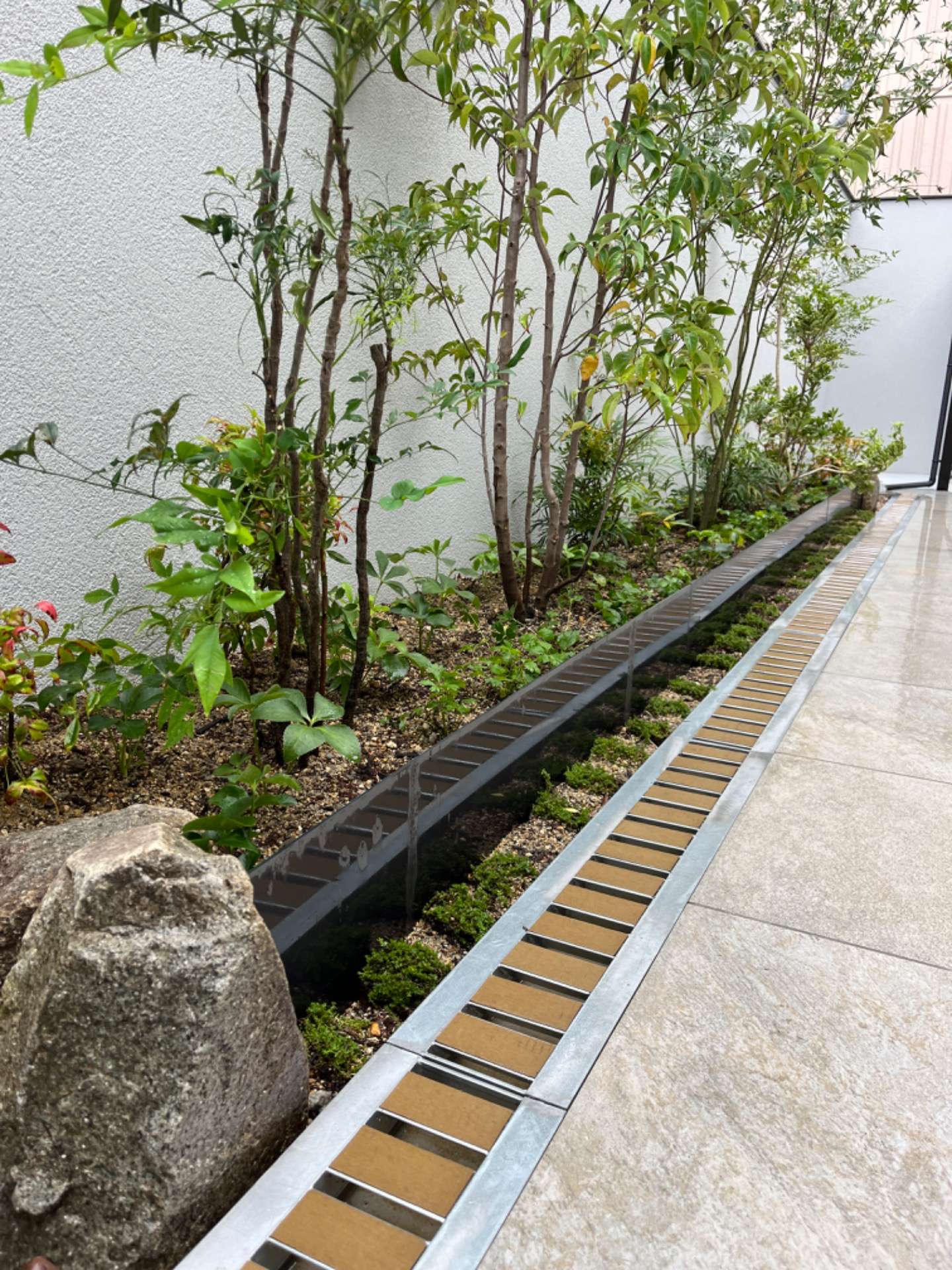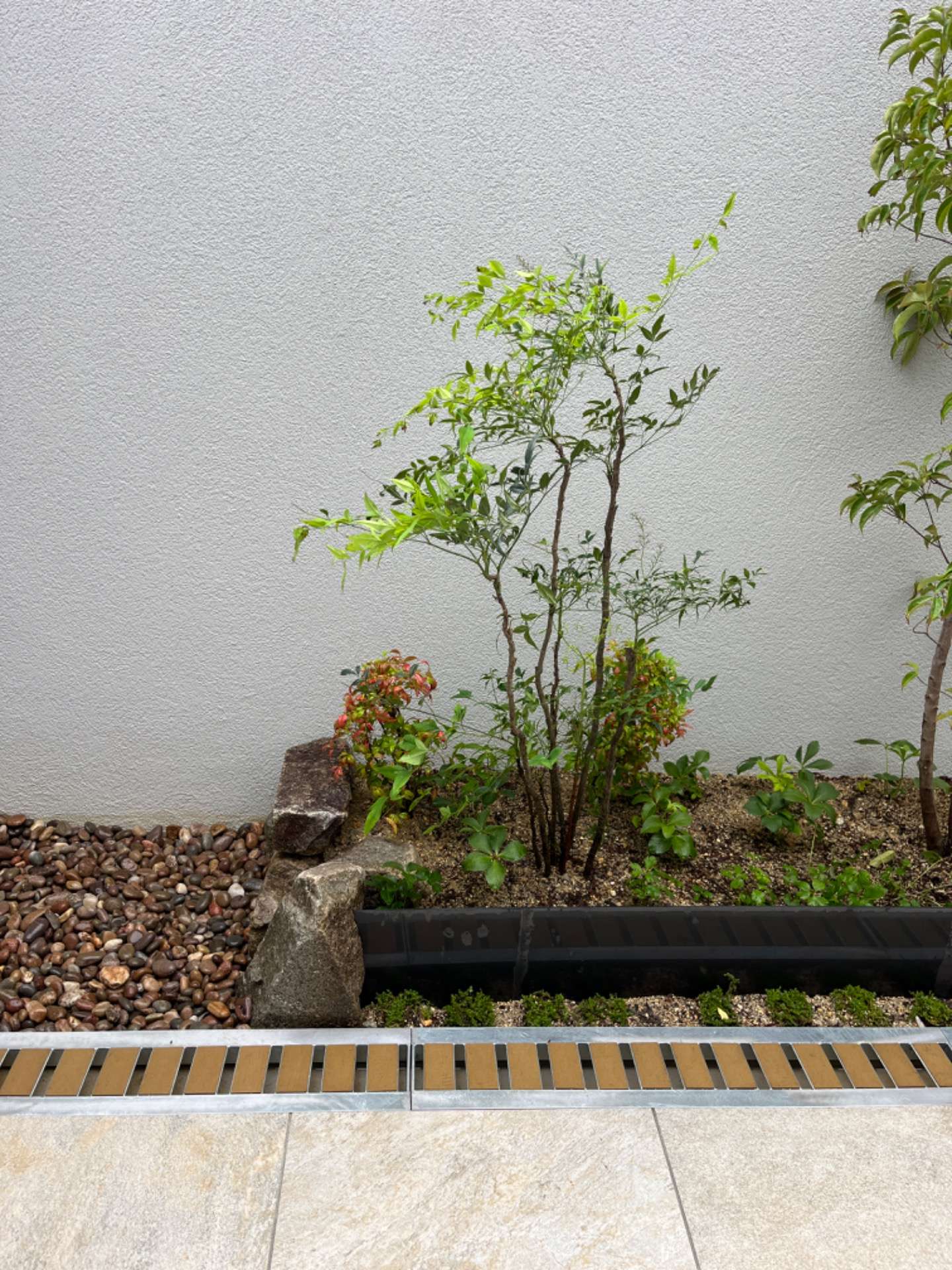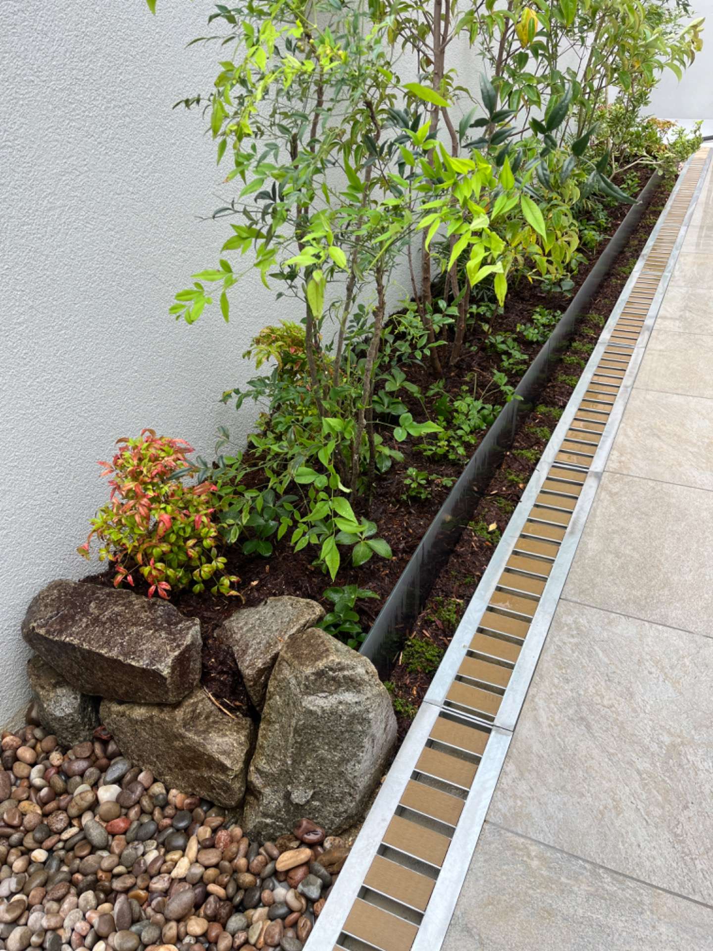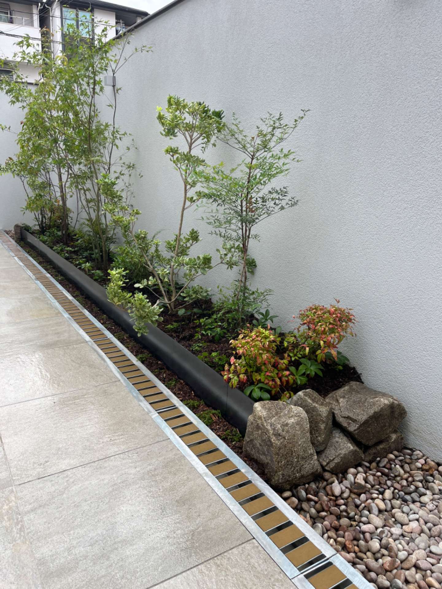 花壇の素材は、和良石とコールテン鋼です。コールテン鋼は、耐候性の鉄でサビの被膜をつくりそれ以上に腐食することを防ぎます。この庭のコールテン鋼も半年もすれば綺麗な茶色に変色するでしょう。