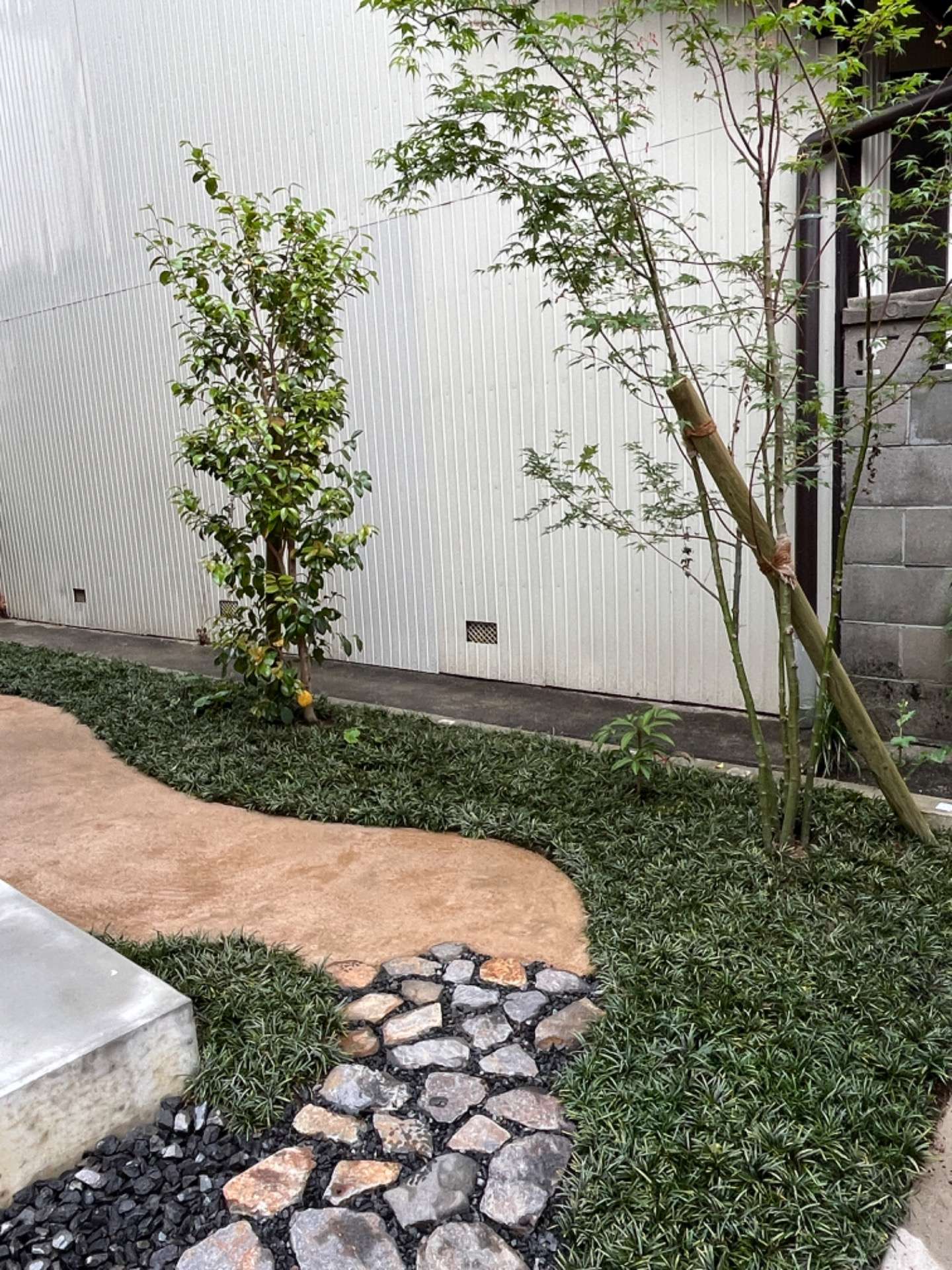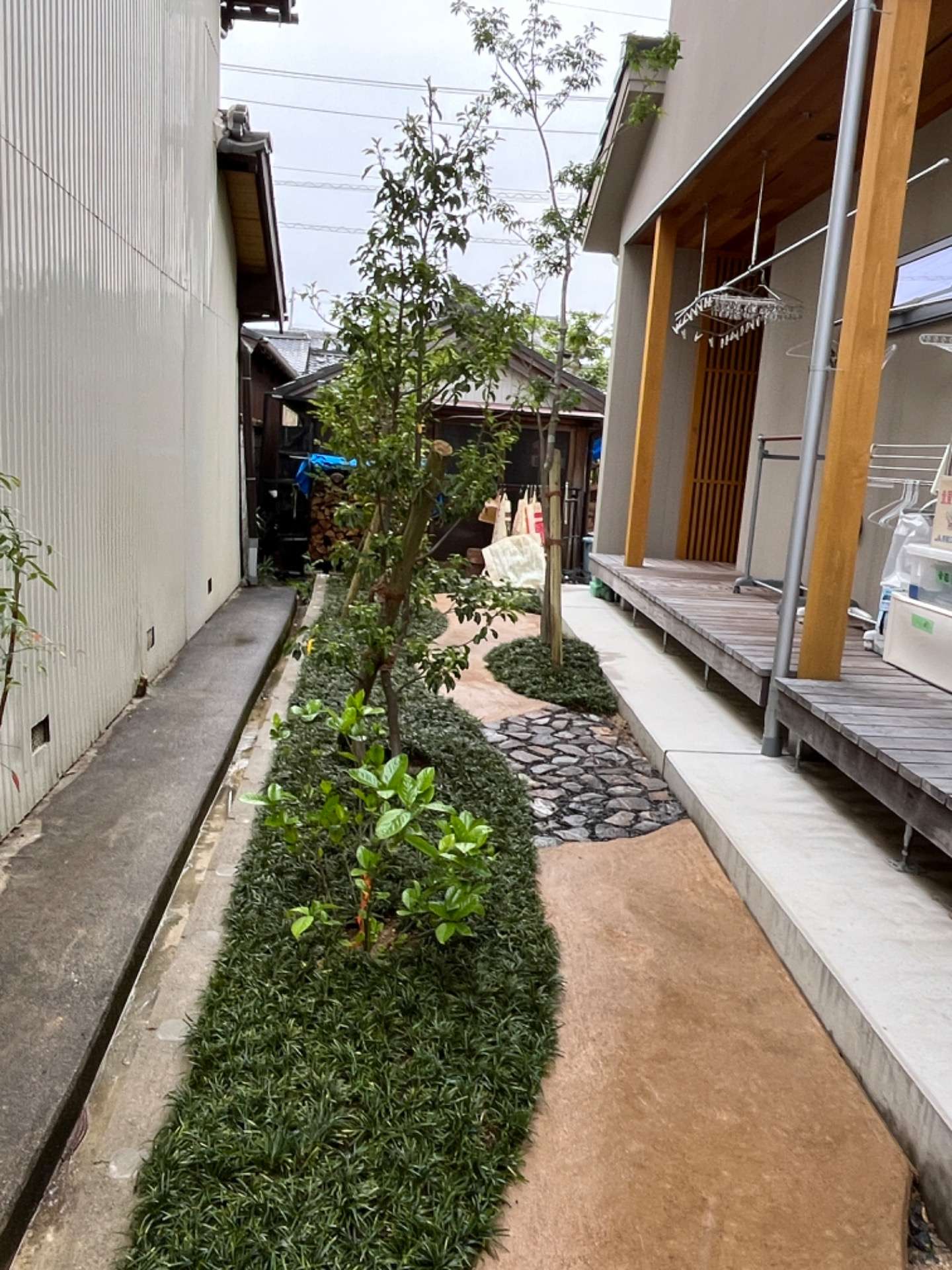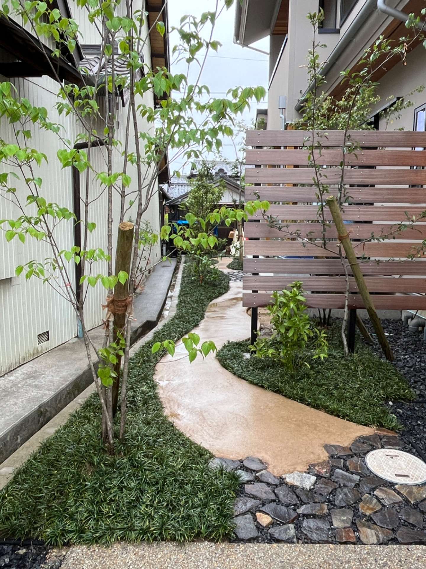 新しい庭部分は、庭へと続くアプローチです。石敷きと土舗装で歩きやすく両側に植栽し、四季の変化を楽しめるように計画しています。
