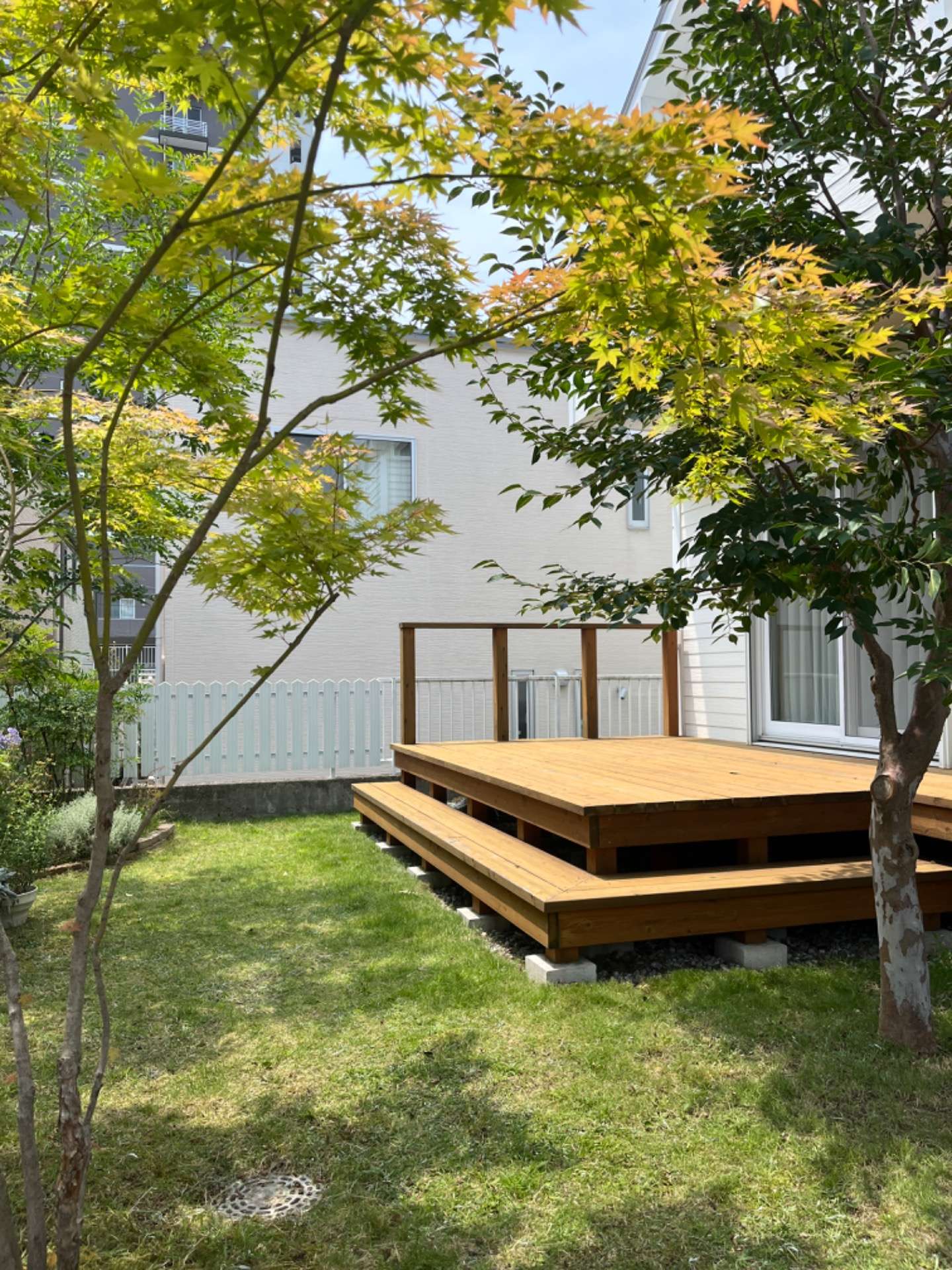 小さなお庭のウッドデッキをつくり直しと植栽計画をしました。既存のシャラノキは強く剪定されていたので、3年くらいかかってのびのびとした樹形へと整えています。